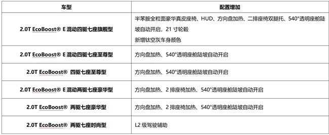 新款延续了福特锐界L特有的2-2-3座椅布局和二排头等舱级空间体验,让全家出游更舒适;大马力E混动系统兼顾了强动力、低油耗和长续航优势,蝉联2023~2024年“中国心”十佳发动机及混动系统奖项;加上全车超50%高强度钢和同级独有的540°透明座舱,成为真正的“全家安心出游神器”。